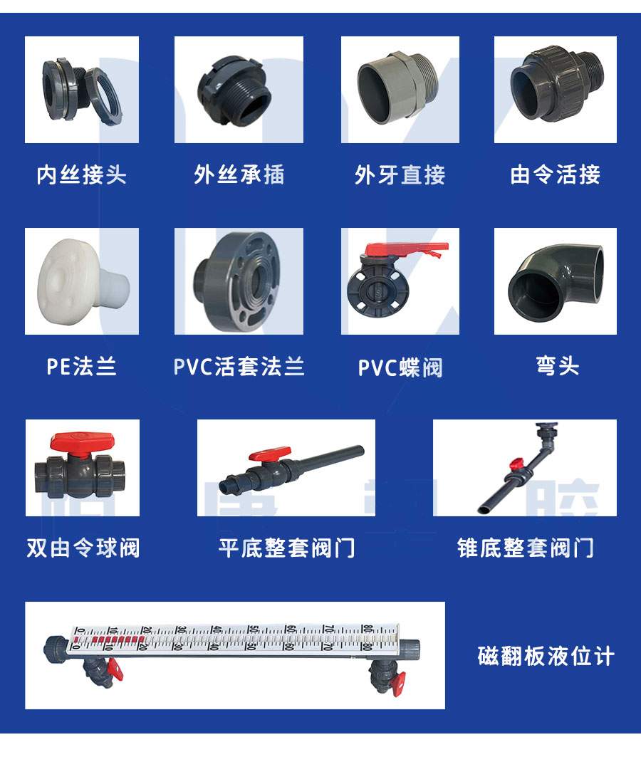 配件:法蘭、PVC化工接頭、磁翻(fān)板液位計、攪拌器(qì)等,根據客戶要求安裝在罐體指定位置;