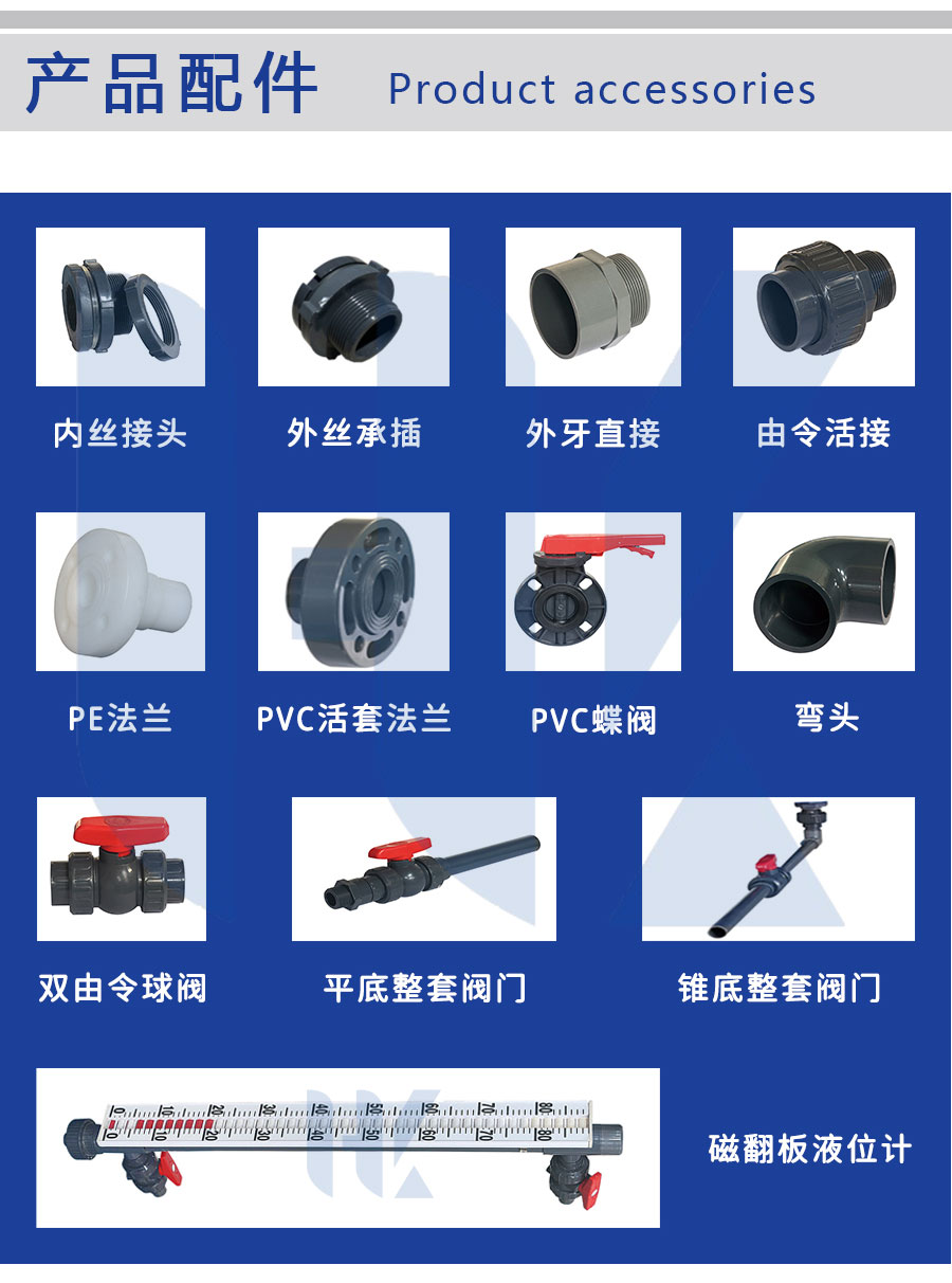 主要配件:攪拌(bàn)器、計量泵、法蘭、PVC化工接頭、液位計等,根據客(kè)戶要求配置及安裝