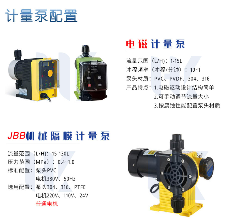 3、水處理加藥裝(zhuāng)置。在水處理過程中(zhōng)向自來水、廢水、汙水(shuǐ)中加藥。主要用於有關給排水處理、環(huán)保等(děng)工藝流程。如自來水廠、賓館(guǎn)、飯店、遊泳池、汙水處理廠(chǎng)等。